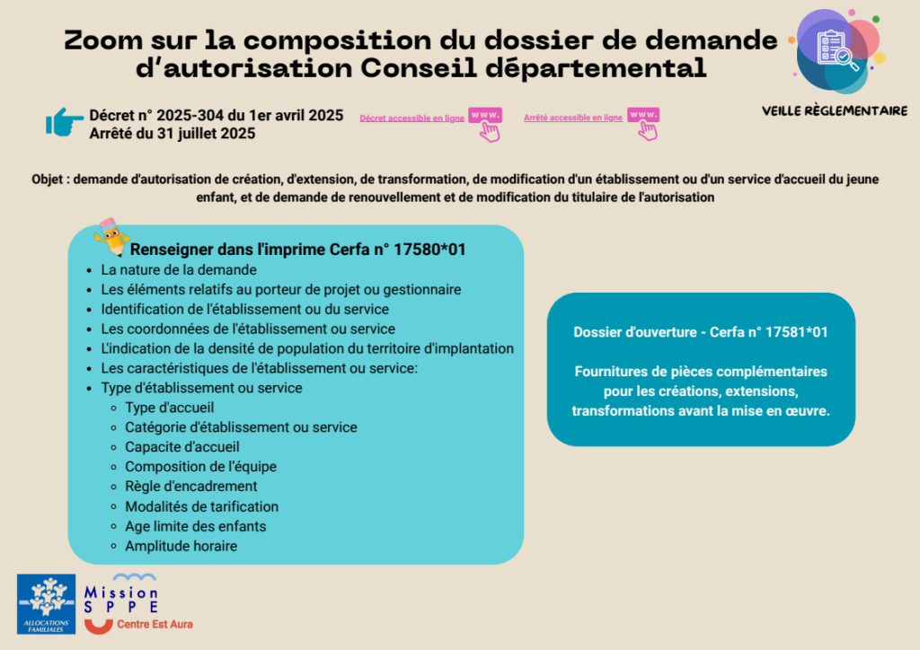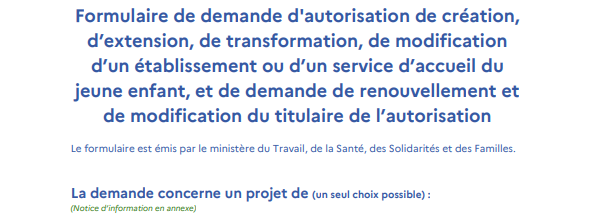CERFA n° 17580*01 | Formulaire de demande d’autorisation de création, d’extension, de transformation, de modification d’un établissement ou d’un service d’accueil du jeune enfant, et de demande de renouvellement et de modification du titulaire de l’autorisation