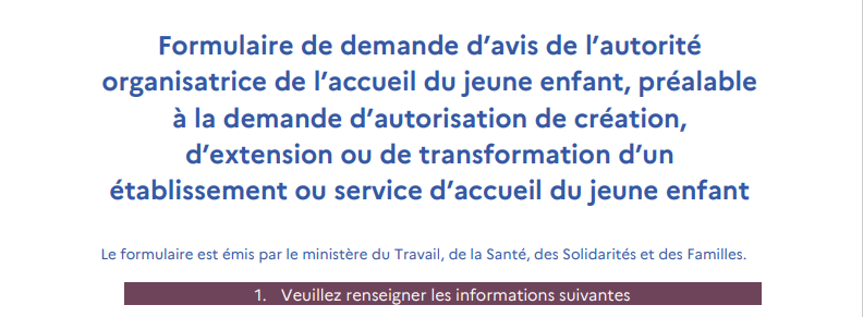 CERFA n°17579*01 | Formulaire de demande d’avis de l’autorité organisatrice de l’accueil du jeune enfant, préalable à la demande d’autorisation de création, d’extension ou de transformation d’un établissement ou service d’accueil du jeune enfant